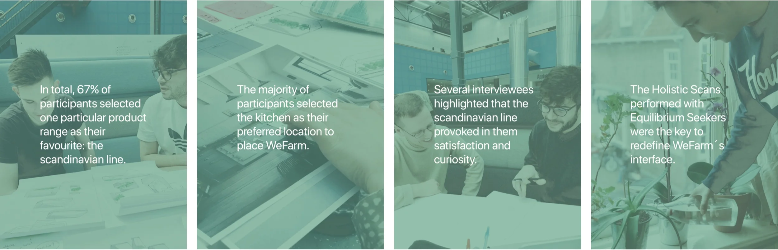 The ideation phase started with the development of different product lines that were further evaluated with Equilibrium Seekers in a series of open interviews and holistic experience scans that serve to lay the foundations of WeFarm final design.